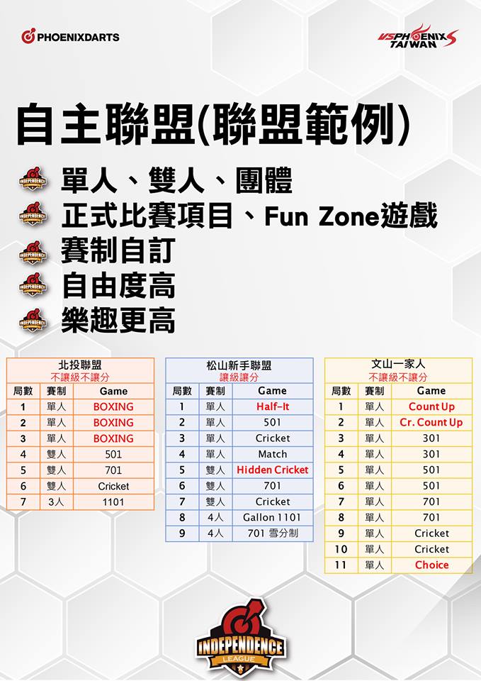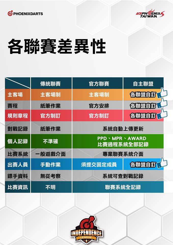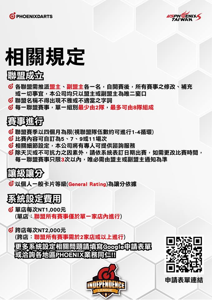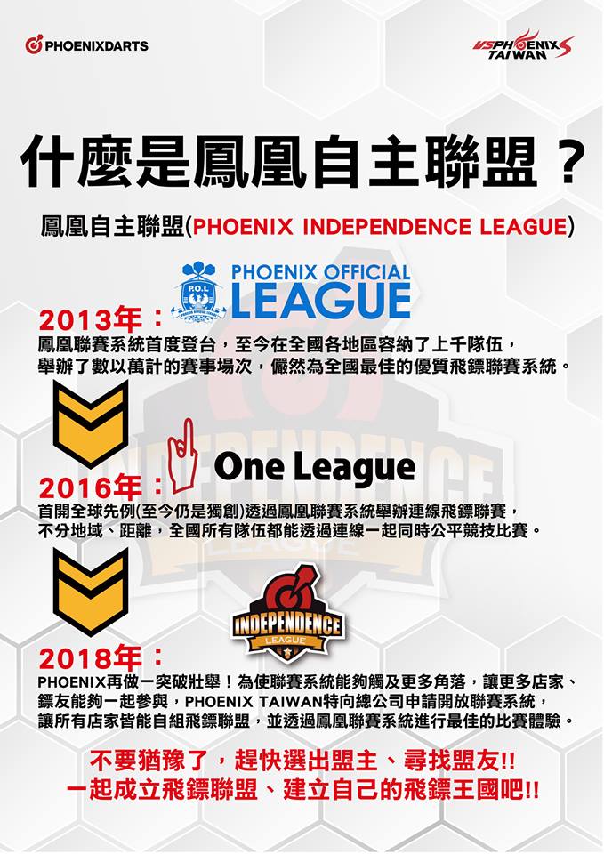 ?為了使更多人能接觸、參與、了解鳳凰聯賽系統,並且讓聯賽制度更人性、更客製、更貼近所有鏢手,即日起我們將開放鳳凰聯賽系統,給予所有鳳凰店家、隊伍使用!!!