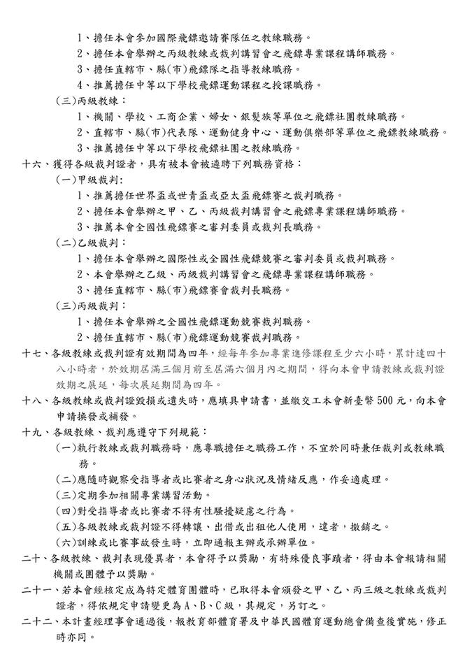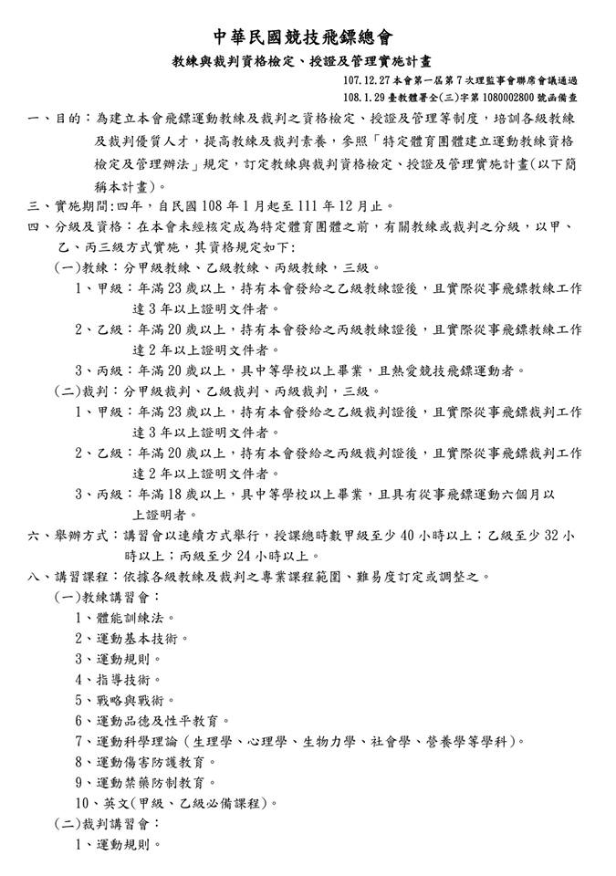 中華民國競技飛鏢總會為建立飛鏢運動教練及裁判之資格檢定、授證及管理等制度,