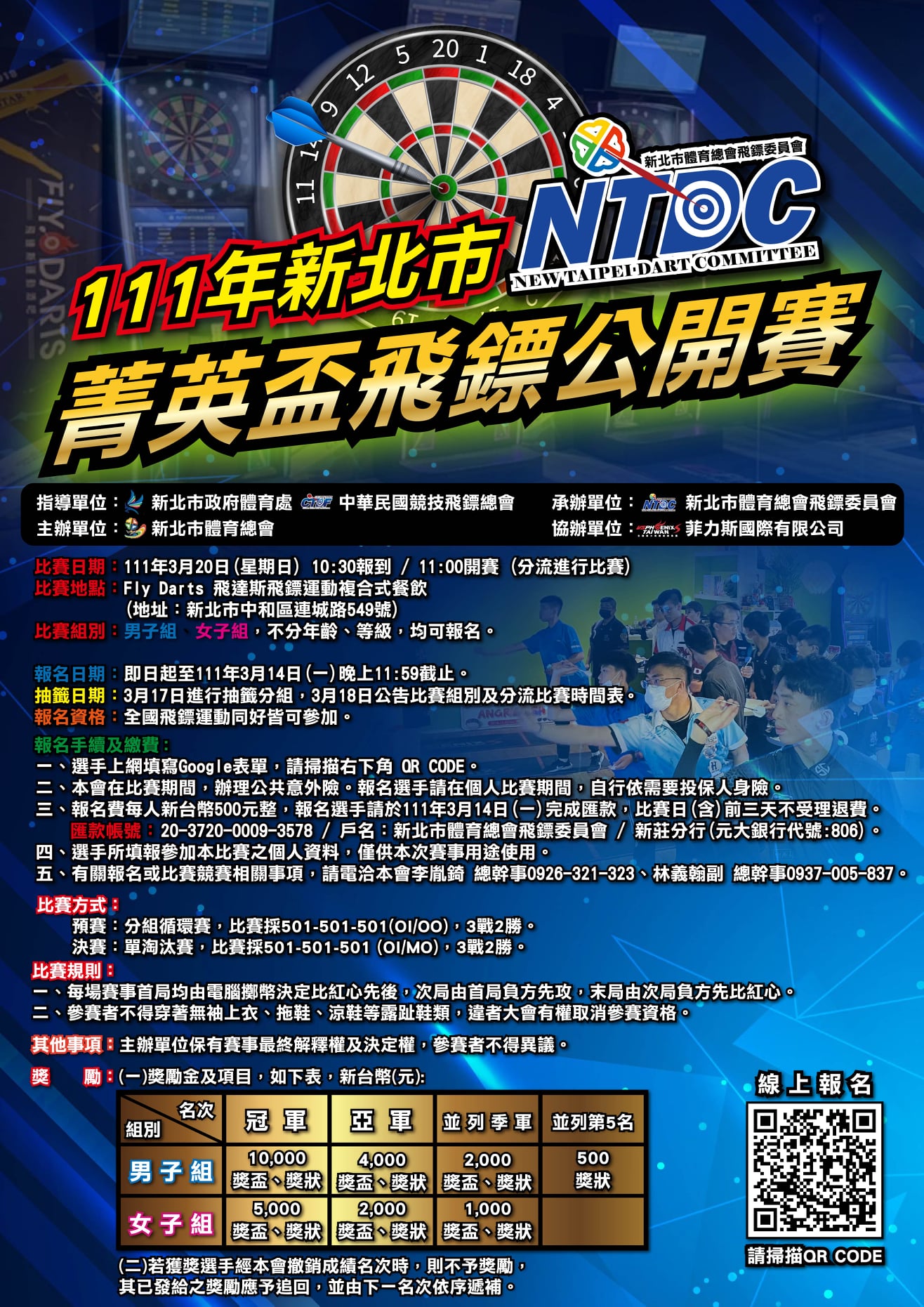 「新北市菁英盃飛鏢公開賽」將於3/20(星期日)舉辦,