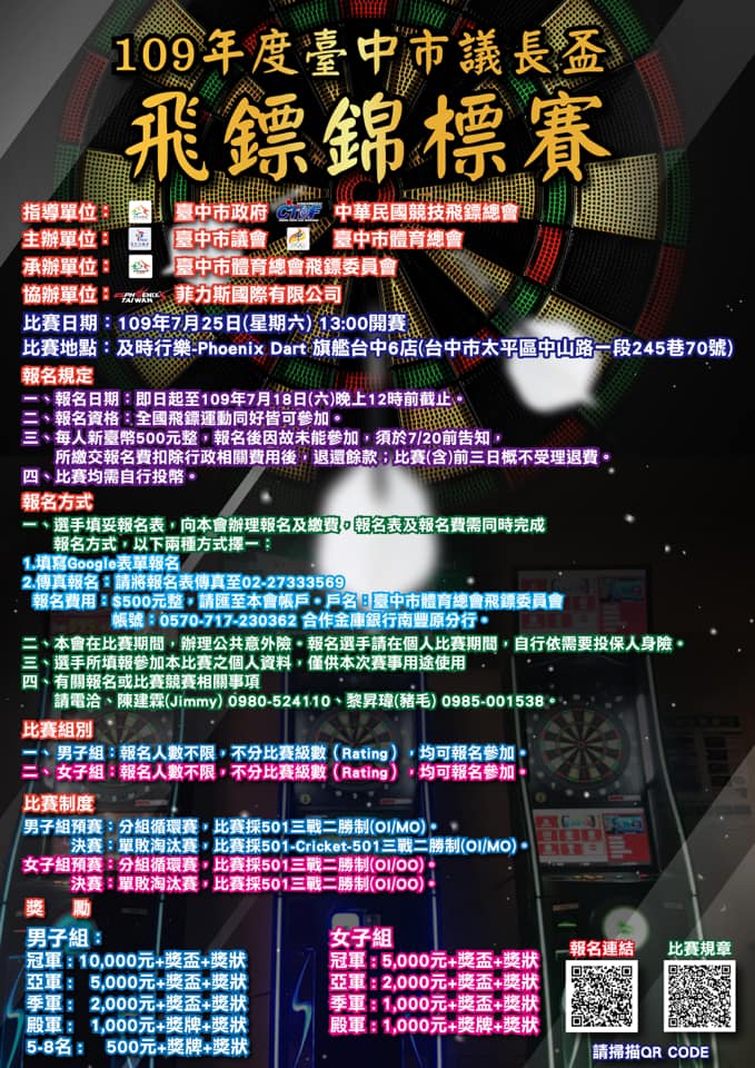 全台灣的鏢友看過來,109年臺中市議長盃飛鏢錦標賽即將登場!