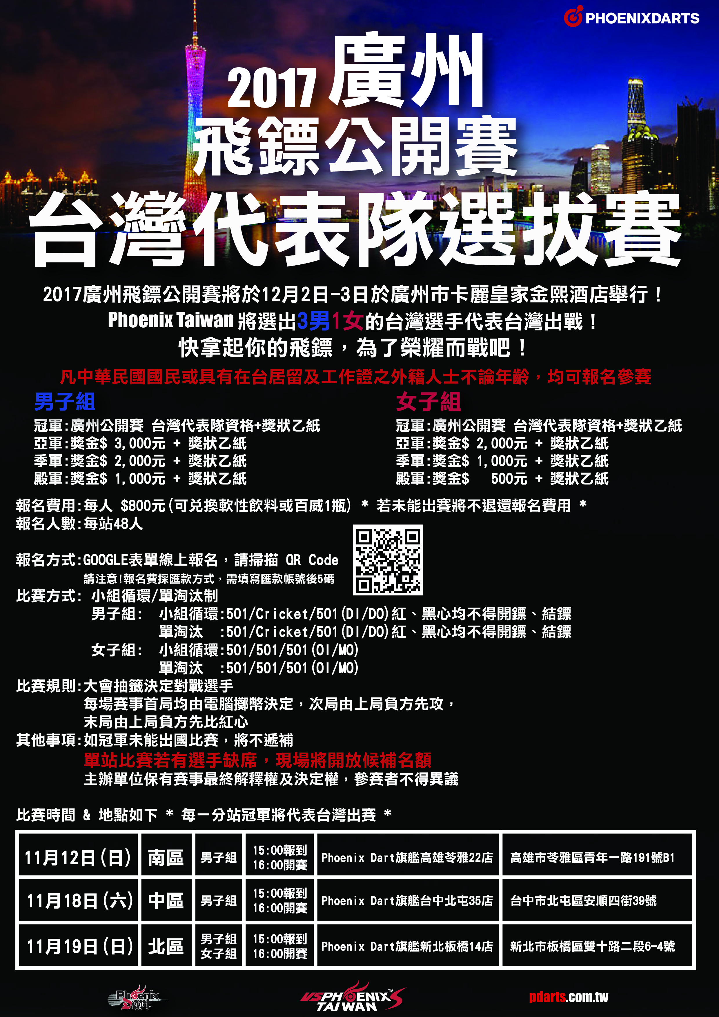 最新消息, 賽事新聞 2017廣州飛鏢公開賽 台灣代表隊選拔 開始受理報名 18 十月 2017年鳳凰廣州飛鏢公開賽將於12月2日、3日於廣州市卡利皇家金熙酒店舉行連2天的賽事! 飛鏢運動在中國也是逐年盛行,熱愛飛鏢運的的人口也逐年增加。 我們台灣也將選拔出3男1女的選手,來為我們台灣爭光! 台灣地區我們將分為北中南3站進行選拔賽,各站冠軍將代表台灣出賽! 每站報名人數: 48人 如單站比賽有選手缺席,現場則開放候補 賽制: 小組循環/單淘汰賽制 本次報名方式採線上報名,報名費以匯款方式 請注意! 報名前須完成匯款動作,以確保您的報名權益! 點此報名 Facebook Twitter Google Email